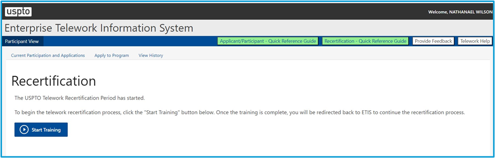Should users state they have completed the USPTO Telework Recertification 2024 but need to go to ETIS to continue their recertification process as seen in the screenshot below…